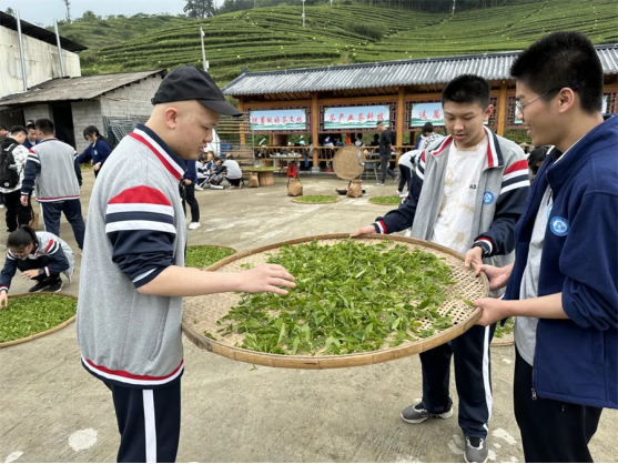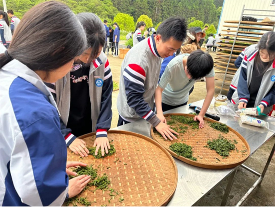 采摘完成后由专业制茶老师傅向大家传授制茶的工艺和要诀:首先要先对刚采摘的茶叶放到热锅里进行杀青,然后对经过杀青的茶叶进行揉捏,再将茶叶放入锅中进行烘干。为避免给茶叶造成损伤,整个制茶过程,都要人工用手温柔地进行操作,同学们积极参与体验,边学边实践,增长知识的同时,提高了动手能力,也从中体会到劳动的艰辛和制茶的乐趣。