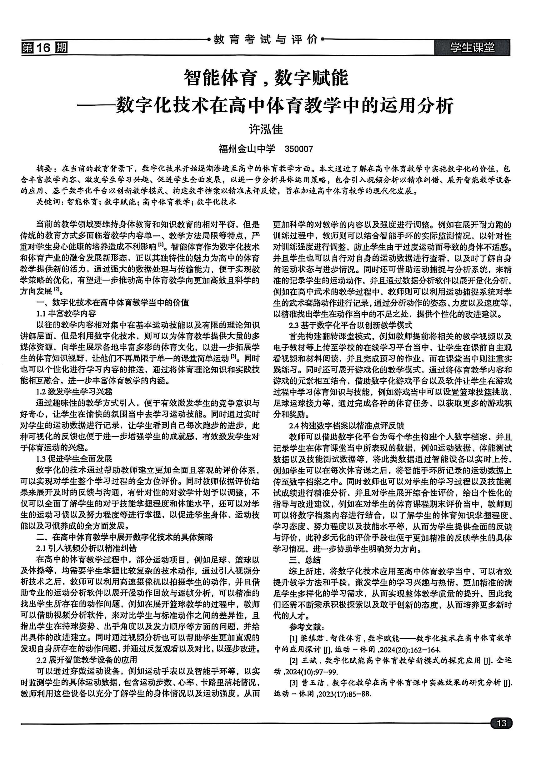许泓佳 智能体育,数字赋能——数字化技术在高中体育教学中的运用分析 教育考试与评价 文章来源:本站原创 作者:教科室 发布时间:2025-09-24 阅读数: 许泓佳 智能体育,数字赋能——数字化技术在高中体育教学中的运用分析 教育考试与评价