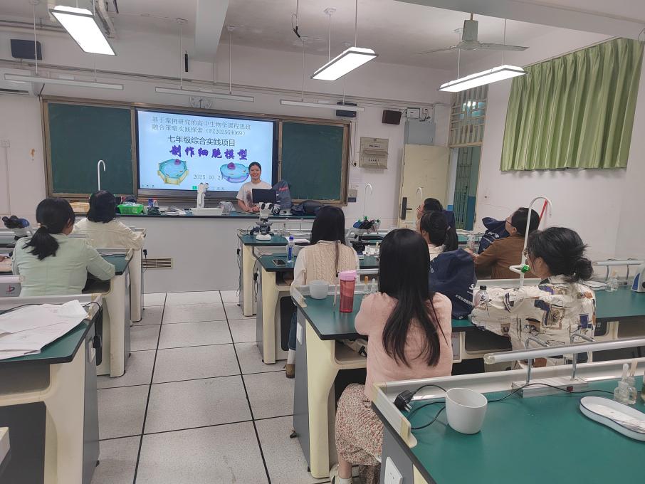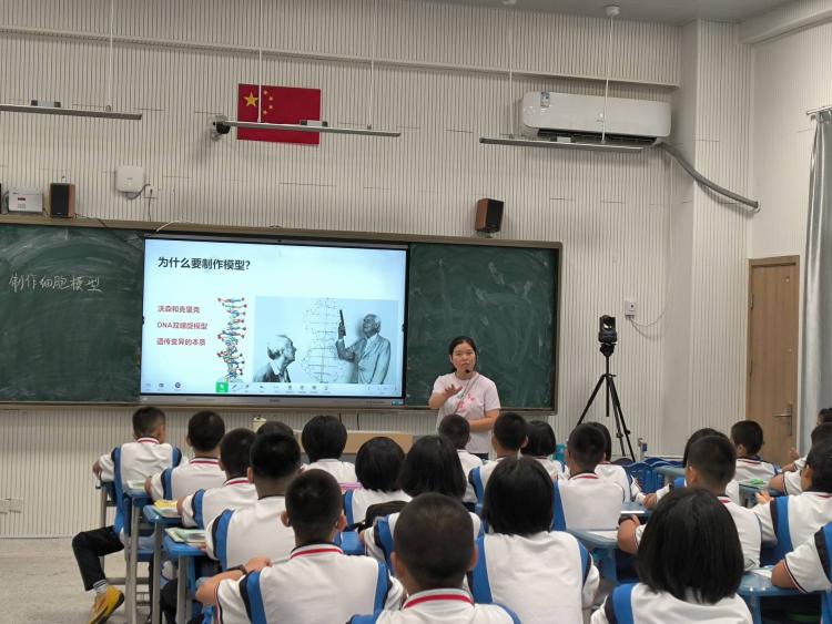 何林芳老师开展 “制作细胞模型” 实践课。课前学生已以小组为单位完成动物或植物细胞模型初步制作;课上,学生上台展示成果后,在何老师引导下用“模型评价量表”开展自评与他评,再针对典型模型共同分析修正方向,各小组进一步讨论完善修正方案并分享,深化对 “细胞是生命活动基本单位”的理解。