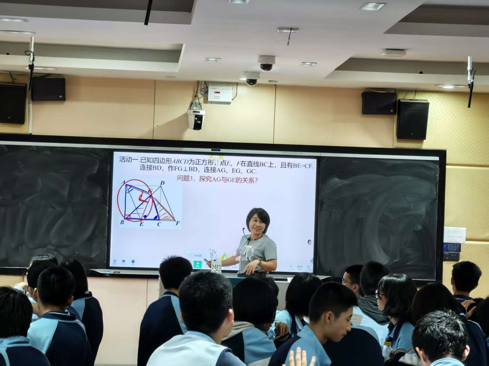九年级李由老师的“玩转正方形” 公开课,用 “识别、提炼、分解、重构”四步法,带大家轻松破解几何难题。课上以正方形为核心,设计三大活动:从基础的全等三角形识别,到利用45°角、轴对称性解构图形,再到通过旋转、四点共圆解决线段关系,每一步都层层递进。比如在活动一中,仅通过“BE=CF”和 “FG⊥BD”两个条件,就延伸出 5个深度问题,教会大家在变换中找定性与定量关系;活动二则拓展到延长线上的点,验证结论普适性,还融入中点计算、最短距离等实用考点。最后课堂小结更是干货满满,总结出“遇特殊角作辅助线”“双直角构四点共圆”等解题技巧,把复杂几何拆解成趣味探索的课堂。