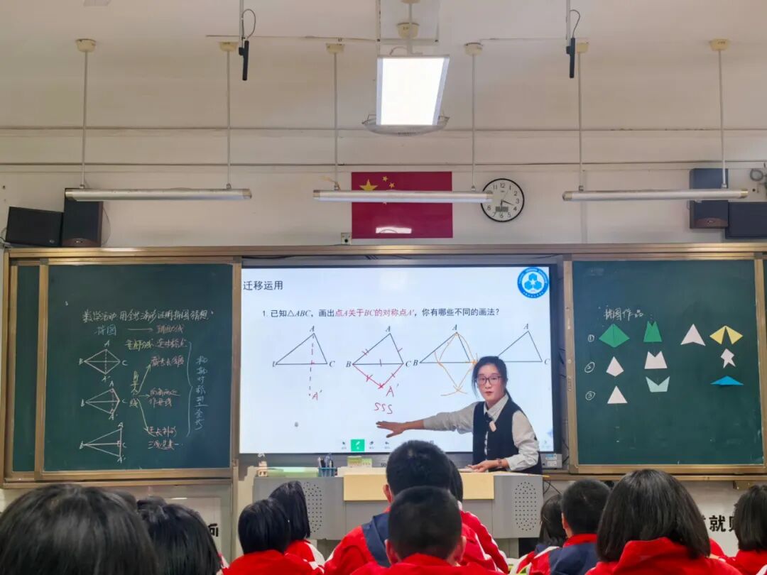 八年级林如老师执教《数学活动:用全等三角形证明拼图猜想》一课,以“轴对称型全等”为核心主线,以“操作—猜想—证明—应用”四步探究为脉络铺展课堂。课始展示学生设计的中式全等美学作品引入任务,课中引导分类拼图、猜想、证明并归纳辅助线方法,并应用所学知识解决轴对称全等的问题,课末用AI数学助手,和学生一起总结解题技巧,深化方法的应用逻辑,让解题思路更扎实。整节课以拼图串联知识,既渗透中式“对称生和”美学,又让学生在实践中深化几何推理,实现“知识+思维+审美”的融合提升,让抽象几何知识变得直观可感。
