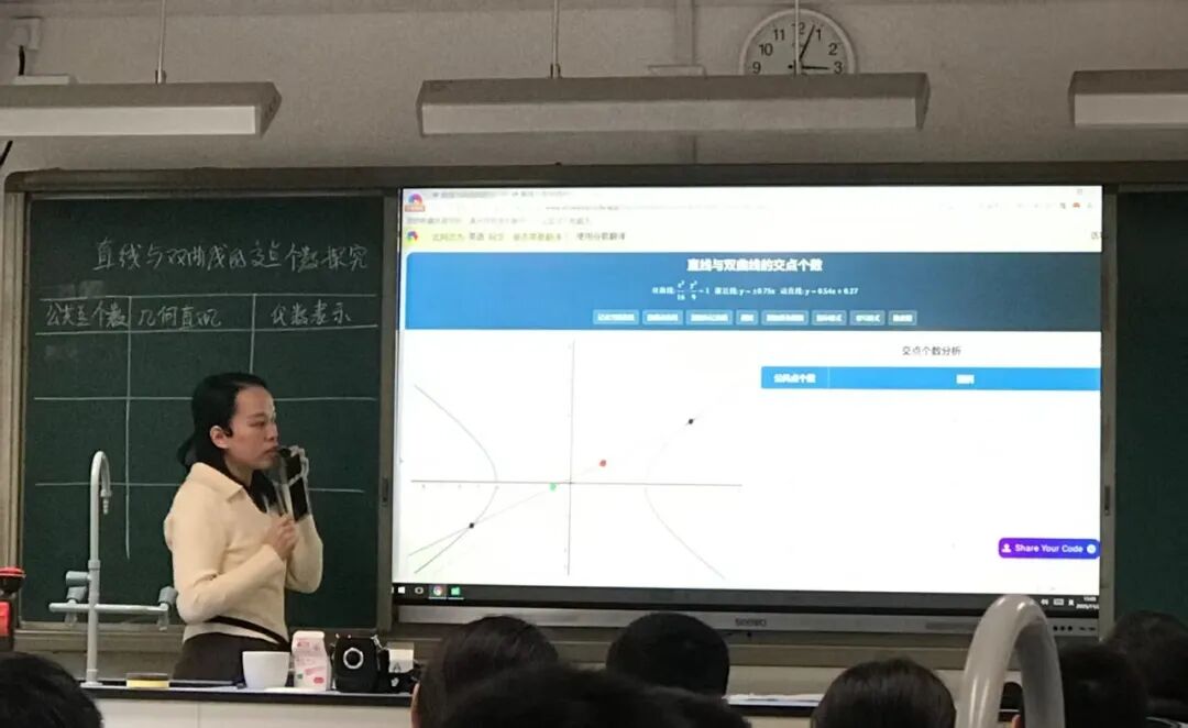 高二年级曾宇燕老师执教的《直线与双曲线的交点个数探究》一课,以课前预习为基础,融合GeoGebra软件演示与代数推导,充分体现“以形助数、以数解形”的思想。课程精选高考真题与分层变式训练,突破含参直线、离心率范围等难点,系统提炼“几何直观+代数验证”的解题策略,强化分类讨论、数形结合、转化与化归等数学思想,切实提升学生的数学抽象与逻辑推理素养。