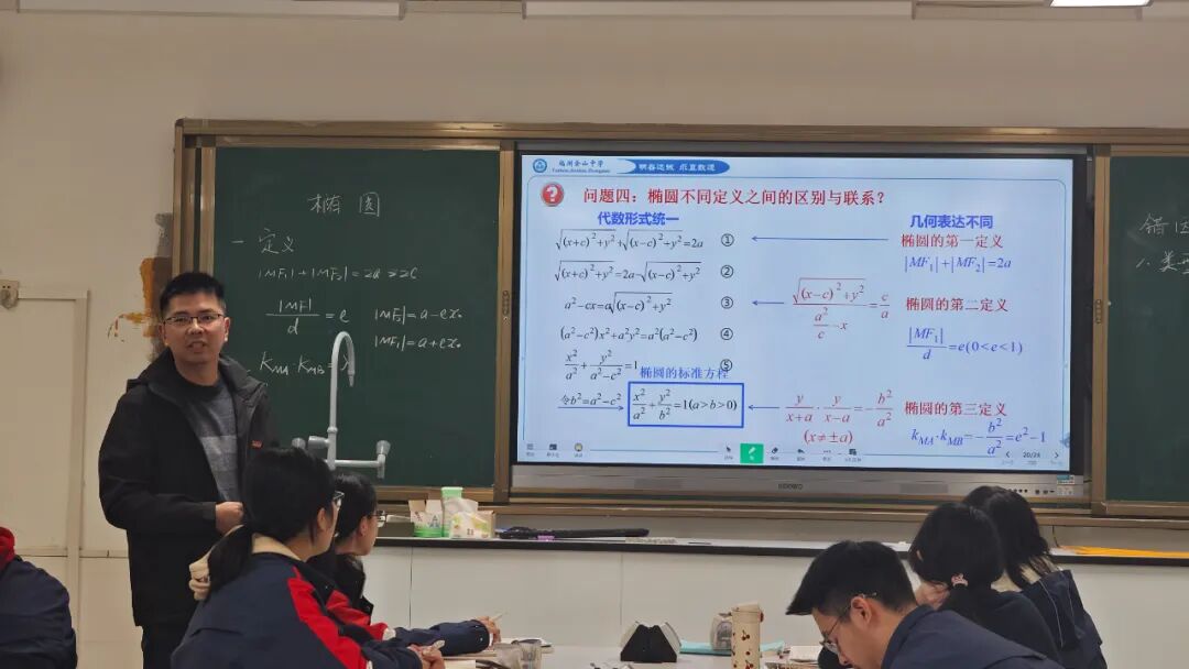 培训围绕“素养导向”展开,特设严飞焰老师执教的《椭圆》高三一轮复习观摩课,彰显 “以生为本、素养导向” 理念,具鲜明示范价值。课程依托智学网数据,以学情诊断为起点,以问题链为牵引,融合GeoGebra软件动画演示为辅助,串联椭圆三个定义并类比推导,渗透数形结合等思想,构建完整知识网络,落实核心素养。