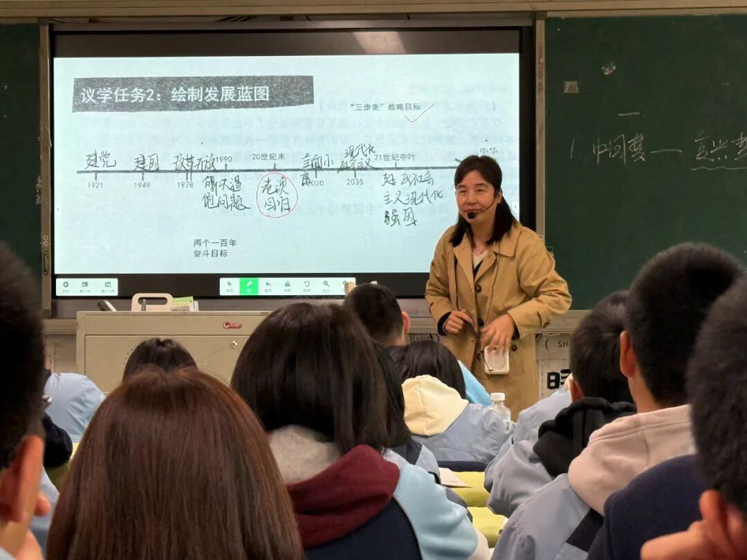 九年级蔡碧玉老师执教《我们的梦想》一课。本节课以“九三阅兵”为核心议题,采用体验式、议题式教学法,融合信息技术赋能课堂。通过播放大国重器视频、分享祝榆生筑梦事迹,引导学生感悟爱国情怀,明晰中国梦“国家富强、民族振兴、人民幸福”的内涵;创设“与先辈跨时空对话”情境,让学生在沉浸式体验中理解新时代的历史方位与新征程战略安排;通过“绘制人生轨迹图”,引导学生将个人梦想与国家发展绑定。课后延伸开展“梦想大讲堂”活动,夯实思政教育实效,引导学生以实干践行梦想,争做民族复兴的接力者。