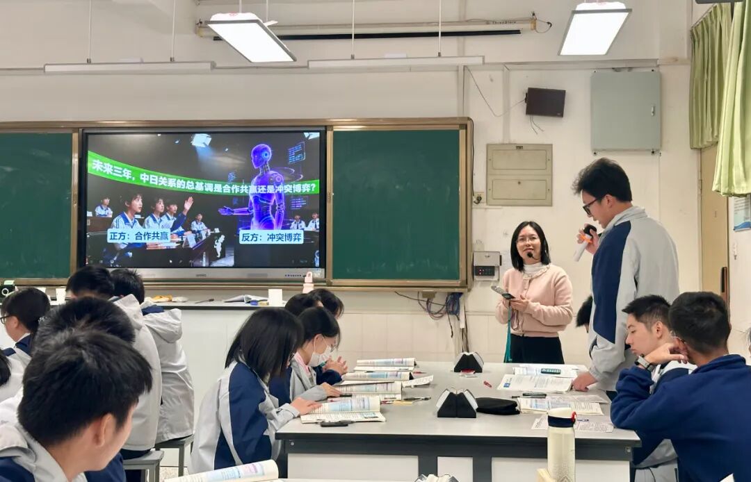 高二陈蕾老师执教《国际关系》一课。本课采用议题式教学,围绕“探究中日关系,破译国际关系‘通用密码’”的总议题,通过“中日交往形态”、“关系周期变幻”、“未来走向预测”三大子议题层层推进。每个子议题下都设计了学生活动,充分发挥学生的主体作用。课堂上,陈老师合理利用技术工具即时反馈学生的真实学情,引导学生充分交流和探讨,深化对知识的理解。最后的辩论环节精彩纷呈,学生作为“合作共赢”的正方与AI展开激烈交锋,综合运用所学知识阐述观点并加以论证。